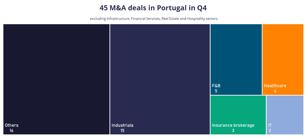 The Portuguese M&A market recorded 45 transactions in the fourth quarter of 2025, with a strong activity in the Industrials sector, which accounted for 15 deals, and in the F&B sector, with 5 transactions. Of the total number of transactions, 31 were led by domestic investors, and 28 by private equity funds or their portfolio companies.