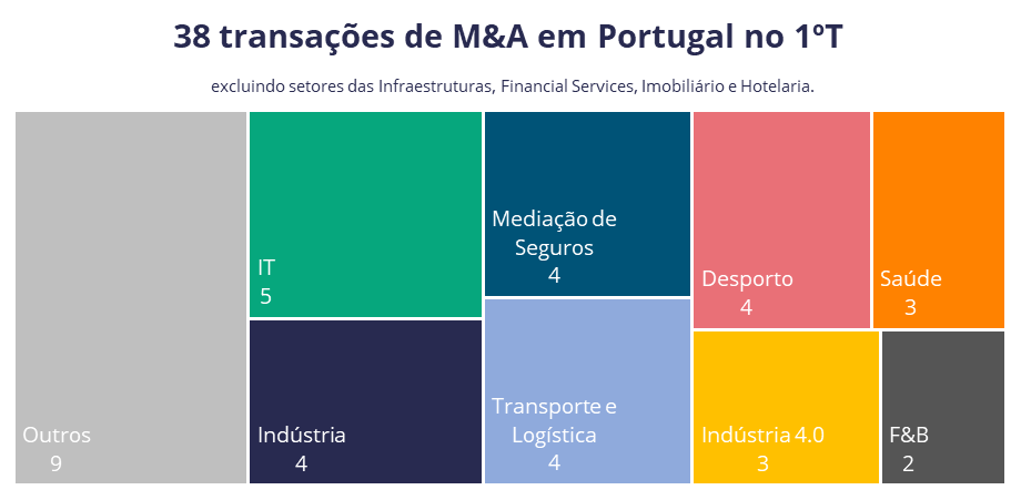 O primeiro trimestre de 2025 registou um total de 38 transações em Portugal, com destaque para os setores do IT com 5 transações, da Indústria, Transporte e Logística, Desporto e Mediação de Seguros com 4 transações cada. Os setores da Indústria 4.0 e Saúde contabilizaram 3 transações, enquanto o setor dos F&B somou 2 operações.