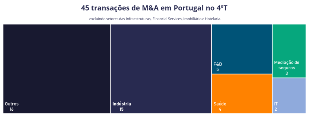 O mercado de M&A em Portugal registou 45 transações no quarto trimestre de 2025, com particular dinamismo nos setores da Indústria, que concentrou 15 operações, e de F&B, com 5 transações. Do total de transações, 31 foram lideradas por investidores nacionais, e 28 protagonizadas por fundos de capital de risco ou pelas suas participadas.